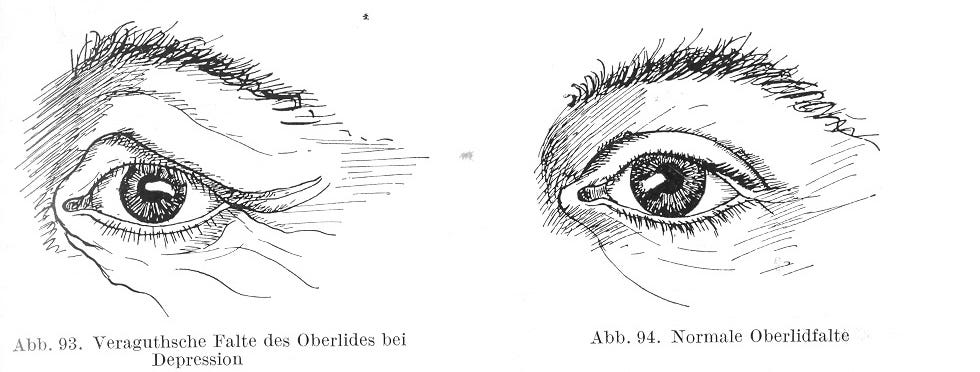 Redan Charles Darwin beskrev en omega-formad rynka mellan ögonen hos personer med melankoli. Hos djupt deprimerade personer ser man även ibland Veraguths tecken, vilket är ett veck i övre ögonlocket enligt nedan.